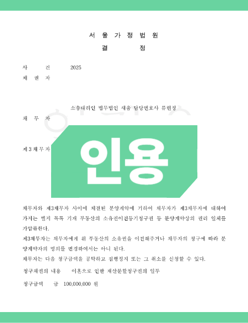 또한, 1억 원의 재산분할 청구권을 피보전채권으로 하여 1,000만 원의 보증보험을 통해 가압류 결정을 받았습니다. 최근 법원에서 보증보험을 전액 인정하는 경우가 드물지만, 철저한 대응 덕분에 성공적으로 보전처분을 마칠 수 있었습니다.