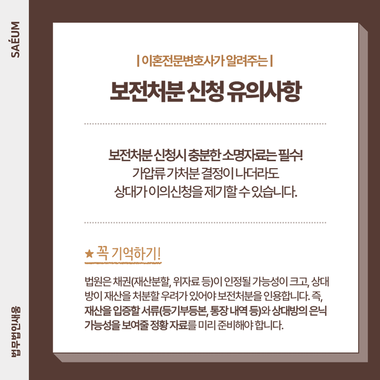 이혼소송에서 재산을 보호하는 것은 단순히 상대방과의 법적 다툼이 아니라, 미래를 대비하는 중요한 과정입니다. 상대방이 재산을 숨기거나 처분하지 못하도록 하기 위해서는 보전처분(가압류·가처분) 신청이 필수적입니다.