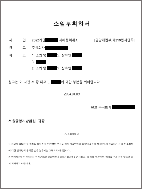 카드회사 측은 재판진행 중에 패소할 가능성이 높다고 보고, 소송을 포기하겠다며 소취하서를 제출하였습니다.