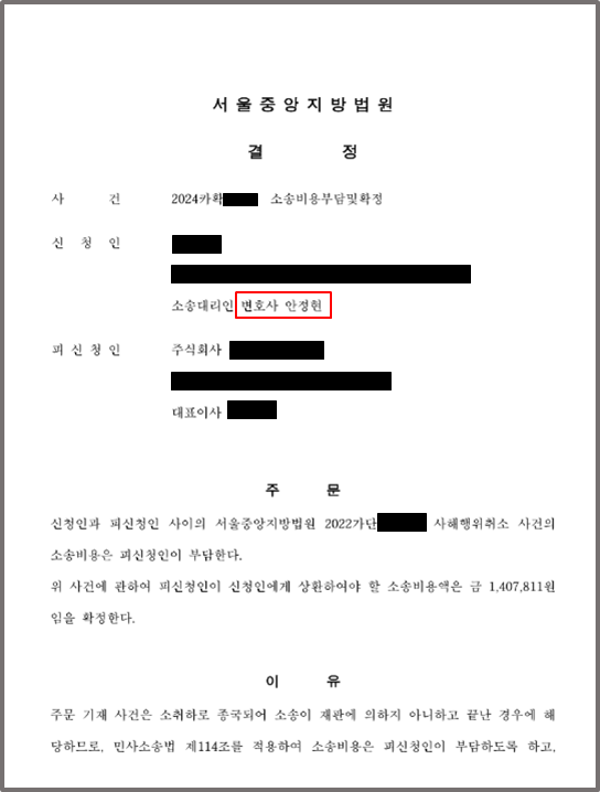 의뢰인은 위 카드회사의 소취하를 받아들이기로 하였고, 이후 의뢰인을 대신하여 가등기에 설정된 가처분의 말소를 요구하여 가처분 말소등기가 이루어지도록 하였으며, 소송으로 인해 발생한 소송비용을 청구하여 이중 일부를 카드회사로부터 받으실 수 있도록 하였습니다.