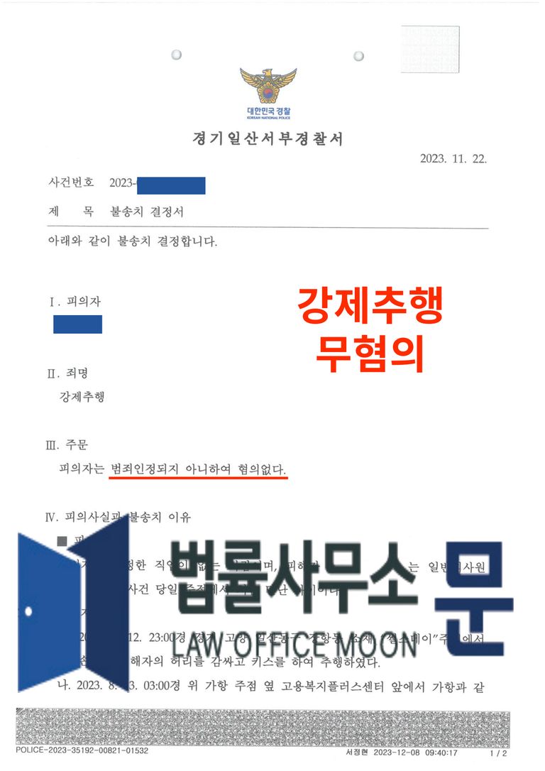 수사기관은 법률사무소 문의 주장을 받아들여, 의뢰인에게 혐의없음 불송치 결정하였고, 사건은 경찰 단계에서 종결되었습니다.