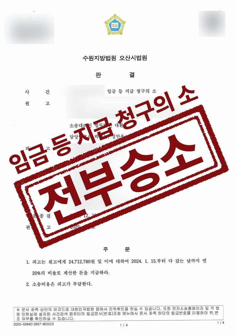 이에 재판부에서는 법무법인 대환의 주장을 전부 받아들여 미지급된 임금 전액을 청구할 수 있도록 판결하였습니다.