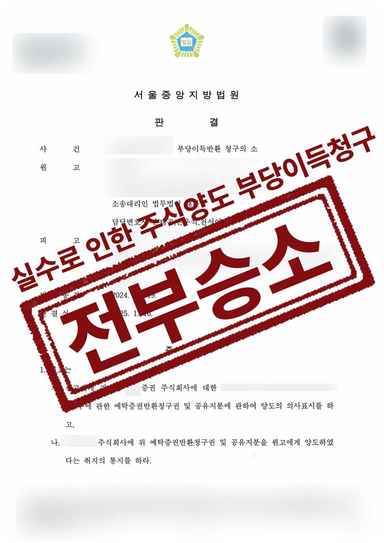 법무법인 대환에서 확인 결과 착오 입력으로 인해 양도된 주식을 반환하지 않고 증권회사 또한 도움을 주지 않아 이는 부당이득에 해당된다고 보았습니다. 원인 없는 이득에 대한 반환을 요청하고자, 부딩이득반환청구소송을 진행하였고 재판부 또한 양도한 주식을 금전으로 환산한 전액을 인정하였습니다.