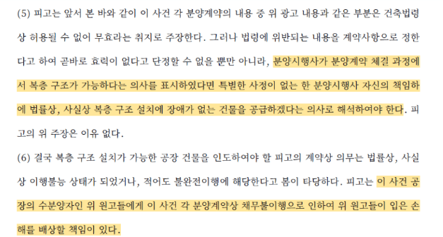 따라서 분양시행사가 분양계약 체결 과정에서 복층 구조가 가능하다는 의사를 표시하였다면 특별한 사정이 없는 한 분양시행사 자신의 책임하에 법률상, 사실상 복층 구조 설치에 장애가 없는 건물을 공급하겠다는 의사로 해석해야 하는데, 이 사건의 건물은 애시당초 건축법령상 복층 구조가 허용되지 않았고 결국 분양계약의 내용과 다르게 지어졌으므로, 법률상 이행불능 상태가 되었다고 판단하였습니다.