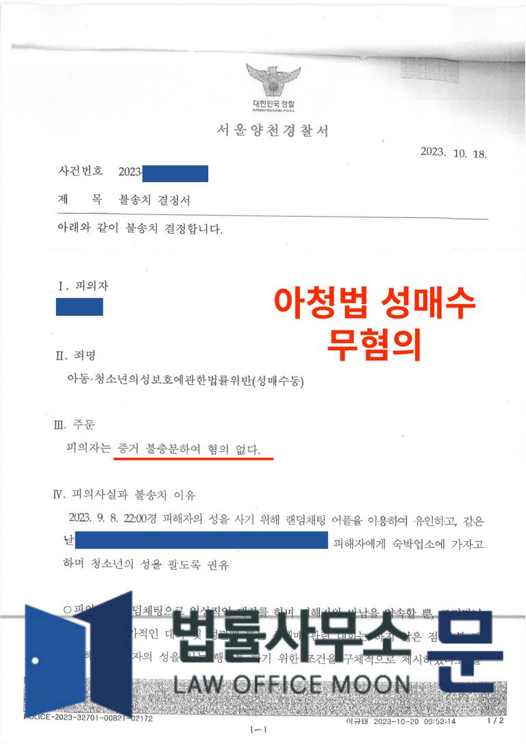 법률사무소 문은 의뢰인과의 신속한 상담을 통하여 의뢰인과 피해자가 나눈 채팅 내용을 치밀하게 분석하였고, 의뢰인이 피해자와 채팅을 통해 만난 점은 사실이나, 피해자에게 화대를 제시하거나 성매수 관련 대화를 나눈 점이 없다는 것을 파악하였으며, 이를 통해 의뢰인이 성을 사기 위해 피해자를 유인하거나 성매수를 권유하지 않았으므로 의뢰인의 무혐의를 주장하기 위한 변론 전략을 수립하였습니다.