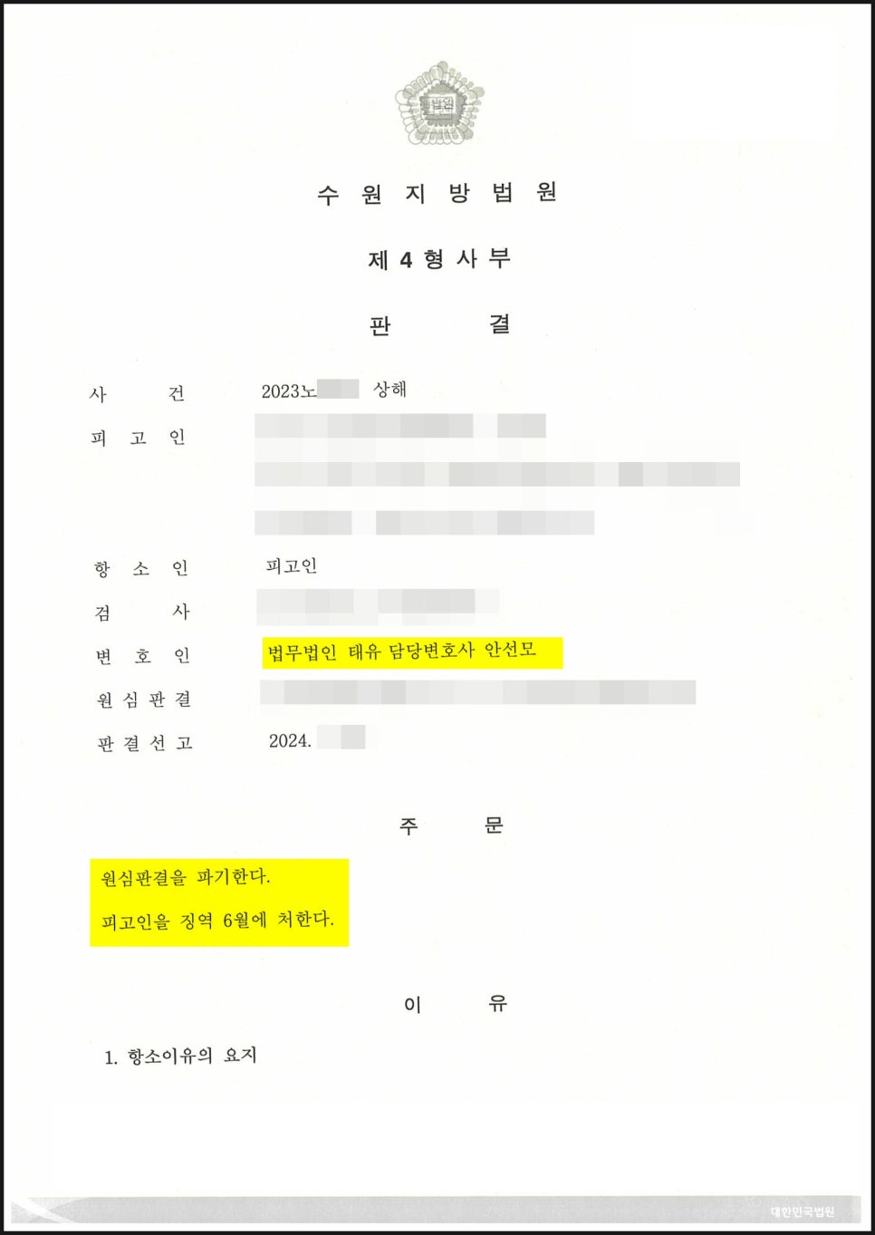 - 항소심 재판부는 피해자와 합의하고 처벌불원을 받은 안변의 노력을 인정하고 의뢰인이 잘못을 깊이 뉘우쳐 다시는 이런 일이 없도록 금주 등의 노력을 하고 있는 점을 참작하여 징역 1년을 선고한 원심을 파기하고, 절반을 감형한 6월을 선고하였습니다.