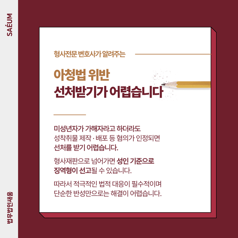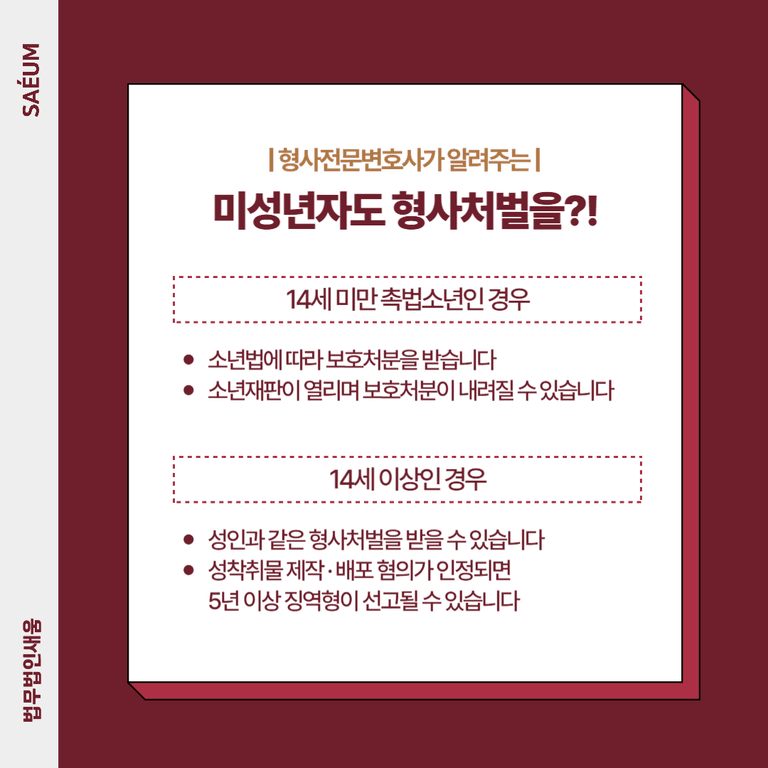 미성년자라 하더라도 성착취물 제작·배포 및 아청법 위반 혐의가 적용되면 선처를 받기가 쉽지 않습니다. 특히 사건이 심각한 경우 형사재판으로 진행될 가능성이 높으며, 소년보호재판으로 진행되더라도 소년원 송치 등 중대한 처분이 내려질 수 있습니다.