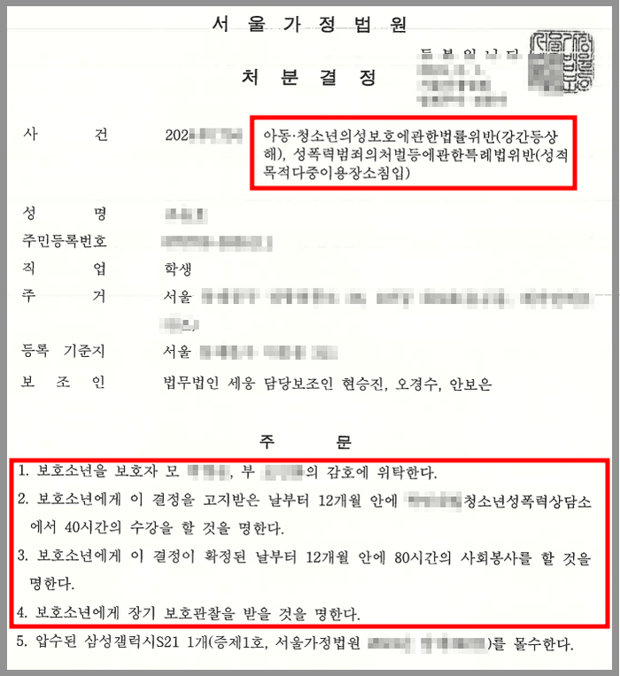 그리고 그 결과 소년법원은 의뢰인에게 부모의 감호 하에 성폭력 관련 교육 수강과 사회봉사, 그리고 보호관찰을 받을 것을 명하는 소년법 제32조 제1호·제2호·제3호 및 제5호의 처분을 하였습니다.