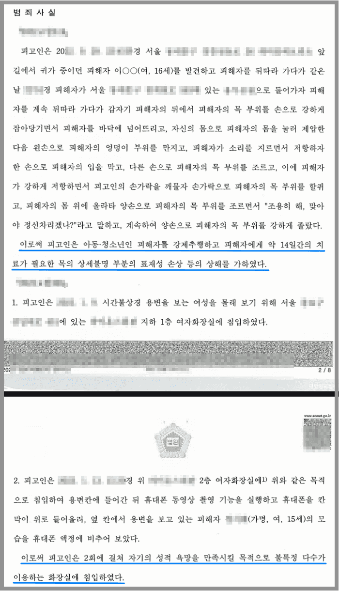 중학생이었던 의뢰인은 ① 귀가 중이던 만 16세의 여학생을 따라가 목을 조르며 강제추행하고 이 과정에서 피해자에게 상해를 가한 범죄사실과 위 사건의 재판 진행 중에 ② 여성의 용변 보는 모습을 훔쳐보기 위해 여자화장실에 침입한 범죄사실 및 ③ 이후 또 다시 여자화장실에 침입하여 여성의 용변 보는 모습을 훔쳐 본 범죄사실로 제1심에서 장기 3년 6개월, 단기 2년6개월의 실형을 선고 받았습니다(다만 피고인이 소년이고 증거인멸의 우려나 도망의 염려가 없다는 점을 들어 법정구속을 하지는 않았습니다).