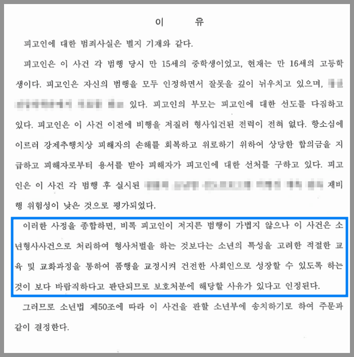 이와 같이 변호인과 부모님이 함께한 노력 덕분에 항소심 법원에서는 범죄의 중대성에도 불구하고 이례적으로 의뢰인에 대하여 소년부 송치 결정을 하였습니다.
