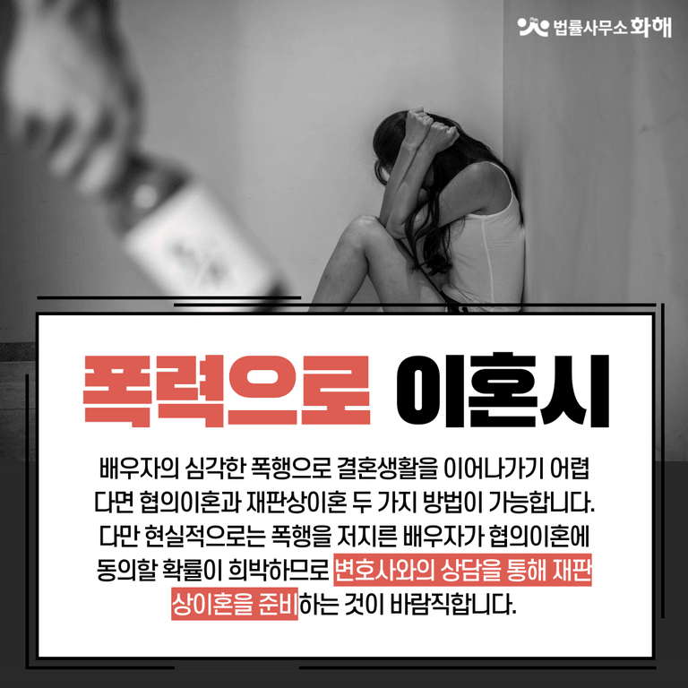 예로부터 가장 심각한 이혼사유로 꼽히는 것이 바로 외도, 도박, 폭력입니다. 이 세 가지의 문제를 겪는 경우 참지 말고 혼인생활을 끝내야 한다고 이구동성으로 말을 합니다.