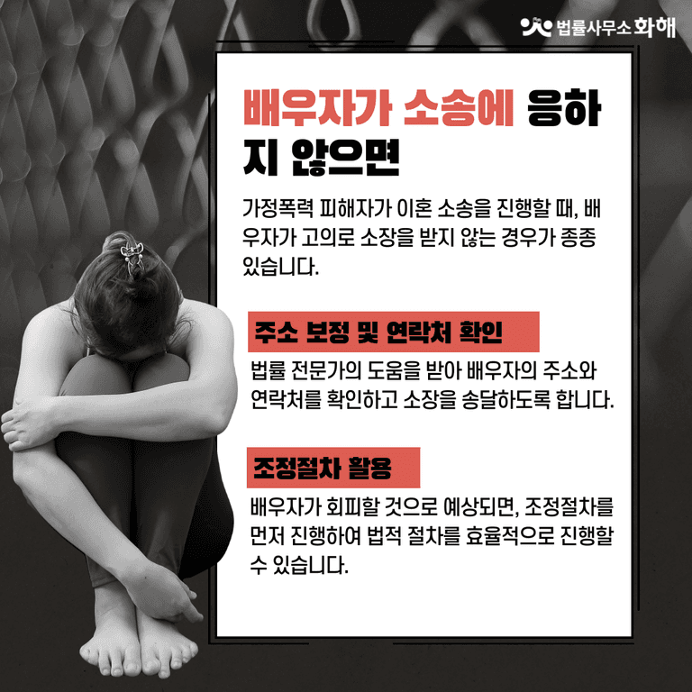 만일 피고인 배우자가 소장을 수령하지 않을 경우 원칙적으로 재판을 여는 것이 불가능하다는 점을 악용하는 것인데요. 연락과 만남을 피하면서 거주지를 파악하기 어렵다면, 법률사무소 화해의 도움을 받아 주소보정과 연락처 확인을 거쳐 소장이 송달되도록 해야 합니다.