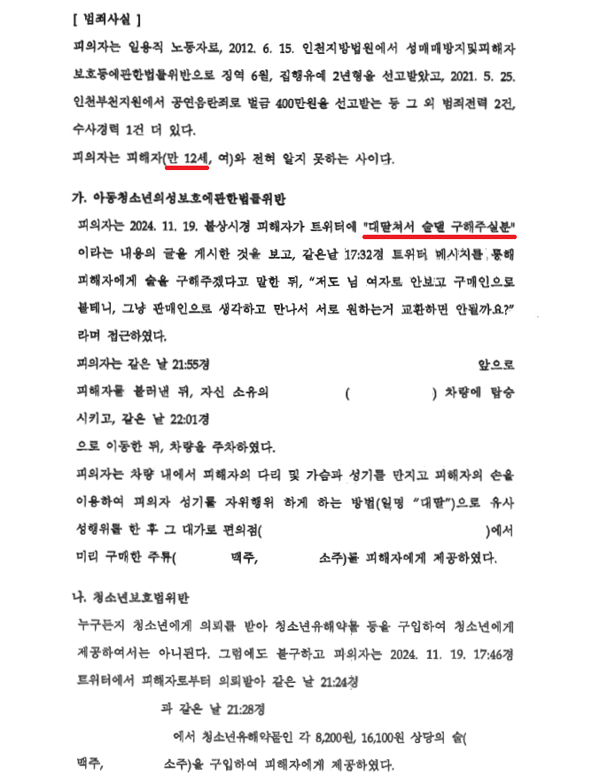 그럼에도 A씨는 2024. 11. 19.경 트위터에서 만 12세 B양이 작성하여 게시한 "대딸쳐서 술댈 구해주실분"이라는 글을 보고 B양에게 연락하여 만난 다음 B양으로부터 손으로 자위행위를 하게 하는 유사성행위, 즉 "대딸"을 받고 대가로 맥주와 소주를 제공하였습니다.