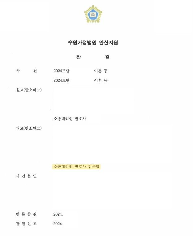 이에 '김은영 변호사'는 배우자가 불륜을 저지르고도 반성하지 않는 모습을 보이는 등 유책성이 더욱 중하므로 위자료가 증액될 필요가 있고, 의뢰인이 20여 년 육아와 가사를 하며 가정에 기여한 바가 상당하므로 재산분할에 있어 최소한 50% 기여도가 인정되어야 함을 적극 주장하였습니다. 또한, 배우자가 자녀에게 지급한 용돈은 양육비가 될 수 없으므로 과거양육비 또한 인정되어야 함을 재판부에 설명하였습니다.