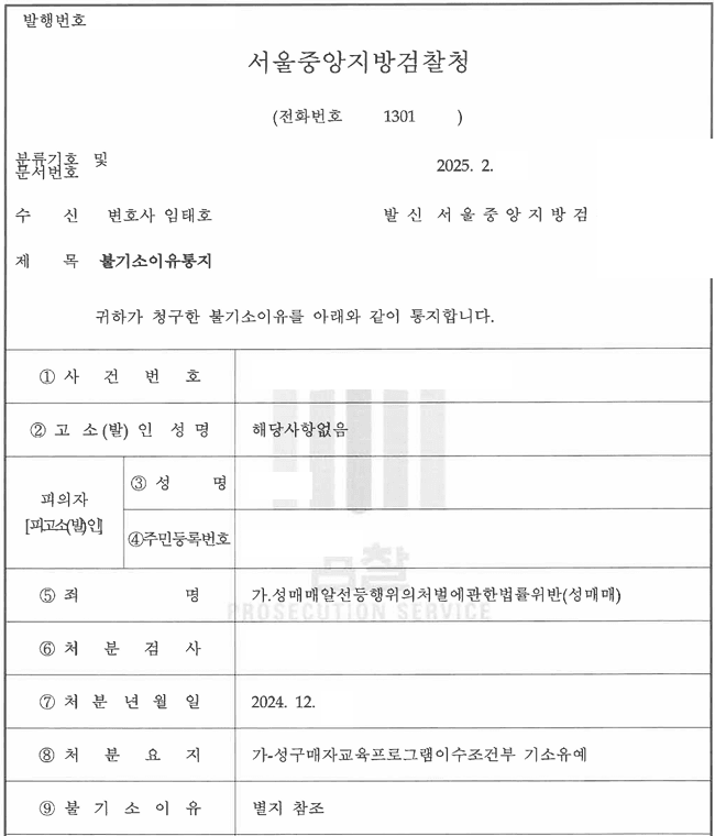 4. 오랜 기다림과 연락, 독촉 끝에 A씨는 성매매 사건에서 저희의 조력을 받음으로써 검찰단계에서 교육조건부 기소유예 처분을 받으셨습니다.