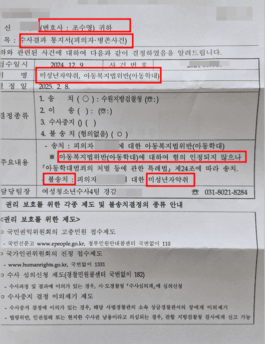 3. 경찰에서는 미성년자 약취유인에 대해서 불송치결정을 하였고, 아동학대 혐의도 최종 불기소처분결정이 내려 짐
