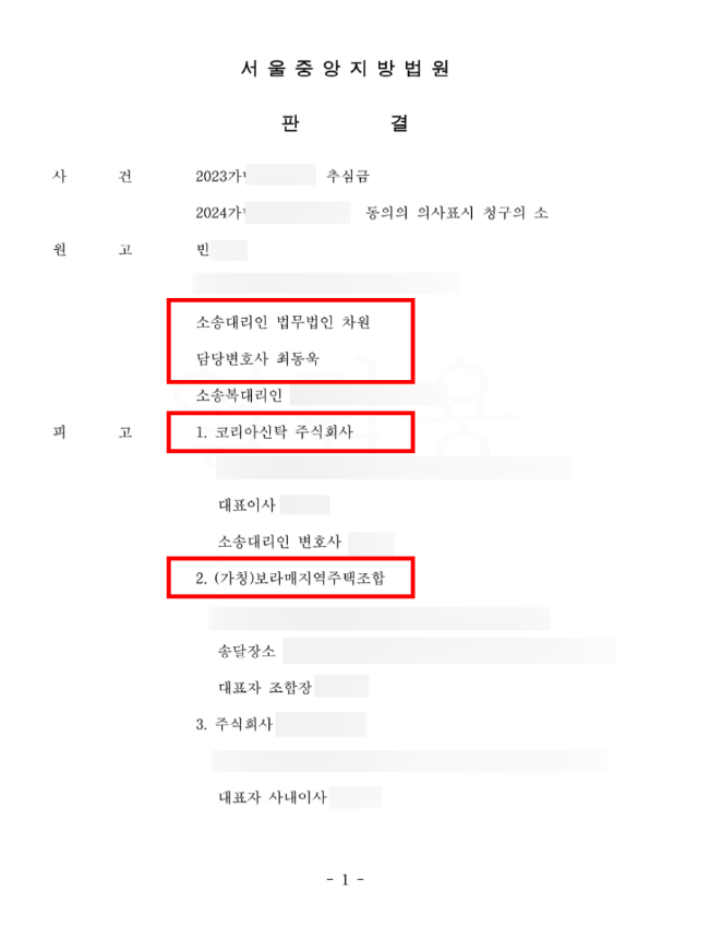 최근 최동욱 변호사를 통해 보라매지역주택조합과 코리아신탁을 상대로 추심금소송을 진행하여 승소하신 성공사례를 설명해 드리겠습니다.
