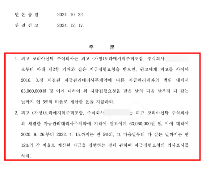 이에 따라 서울중앙지방법원은 피고 코리아신탁 주식회사는 보라매 지역주택조합으로부터 이 사건 자금관리계약에 따른 자금집행요청을 받으면, 원고에게 기납입금 및 그에 대한 지연손해금을 지급할 의무가 있다는 원고 전액승소 판결을 선고하였습니다.