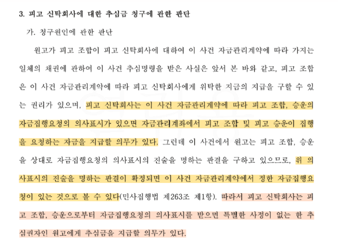 이에 대해 법원은 피고 신탁회사가 이 사건 자금관리계약에 따라 피고 조합의 자금집행요청의 의사표시가 있으면, 해당 자금을 지급할 의무가 있다고 판단하였습니다. 특히 이 사건의 피고 중 하나인 보라매 지역주택조합이 신탁사를 상대로 환불금 지급요청권을 행사하지 않아 의뢰인인 원고가 조합을 상대로 자금집행요청의 의사표시의 진술을 명하는 판결을 구하고 있으므로, 의사표시의 진술을 명하는 판결이 확정되면, 신탁사가 원고에게 추심금을 지급할 의무가 있다고 판시하였습니다.