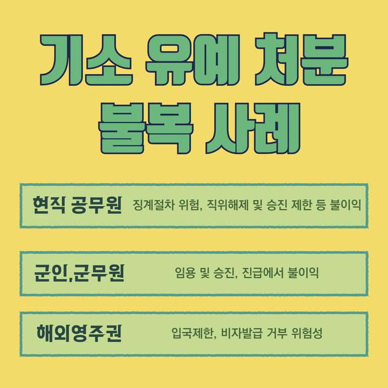 ③ 해외 영주권이나 장기 체류 비자 신청 : 해외 영주권이나 장기 체류 비자를 준비하는 경우에도 기소유예는 불리하게 작용할 수 있습니다. 많은 국가에서는 비자 심사 시 수사경력회보서 제출을 요구하며, 기소유예 기록이 있으면 입국이 제한되거나 비자 발급이 거부될 가능성이 있습니다. 미국, 캐나다, 호주 등은 형사 기록이 있는 경우 매우 엄격하게 심사하므로, 기소유예 처분을 받았다면 이에 대한 불복을 고려해 보셔야 합니다.