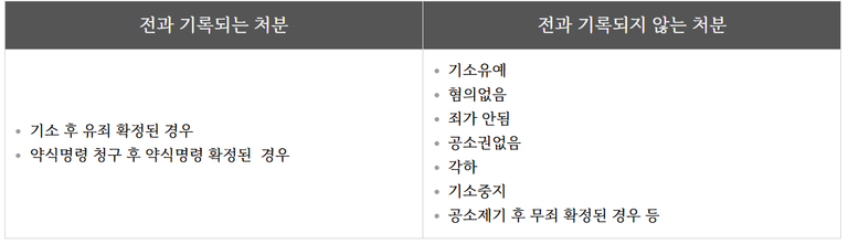 전과는 법원의 유죄 판결로 형이 확정된 경우에만 기록됩니다. 기소유예는 검찰 단계에서 재판으로 넘기지 않기로 한 처분이므로, 법원의 유죄 판결 자체가 없습니다. 따라서 전과로 기록되지 않는 것입니다.