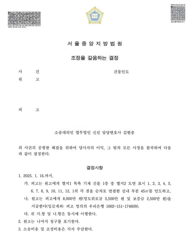 법원에서는 조정으로 사건을 회부를 하였고 조정 절차를 진행하였고, 조정을 통하여 명도위로금을 4,000만원에서 5,500만 원(원고의 청구액에서 약 37%가 상승한 금액)으로 증액시키고 부동산 명도에 대한 합의를 하였습니다.
