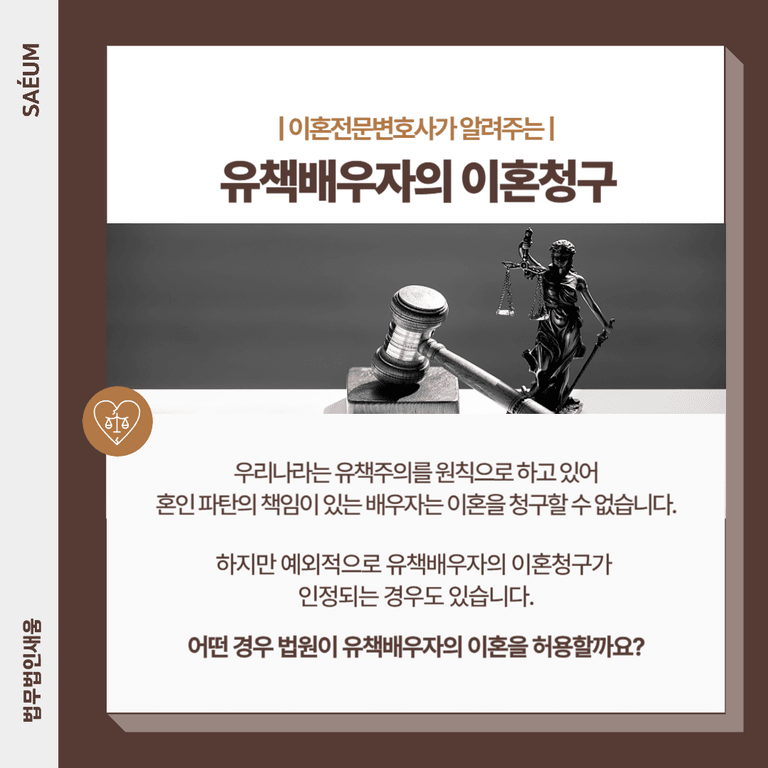이 때문에 자신이 외도나 폭력 등으로 혼인 파탄의 책임이 있다고 생각하는 경우, 이혼을 원하면서도 망설이게 되는 경우가 많습니다. 하지만 예외적으로 유책배우자의 이혼청구가 인정되는 경우도 존재하는데요.