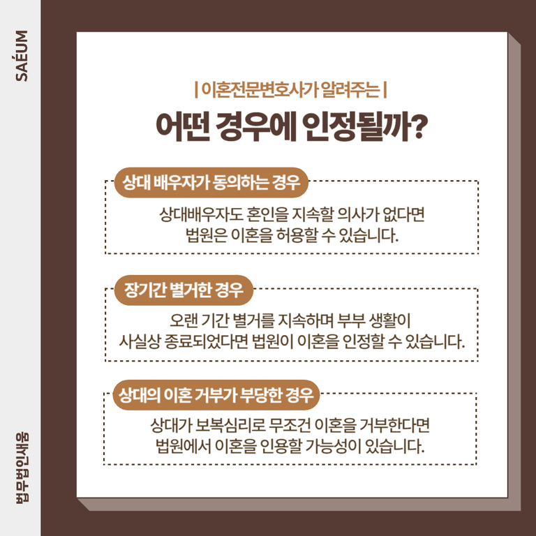 다음 세 가지 경우에는 유책배우자의 이혼청구가 법원에서 받아들여질 가능성이 있습니다.