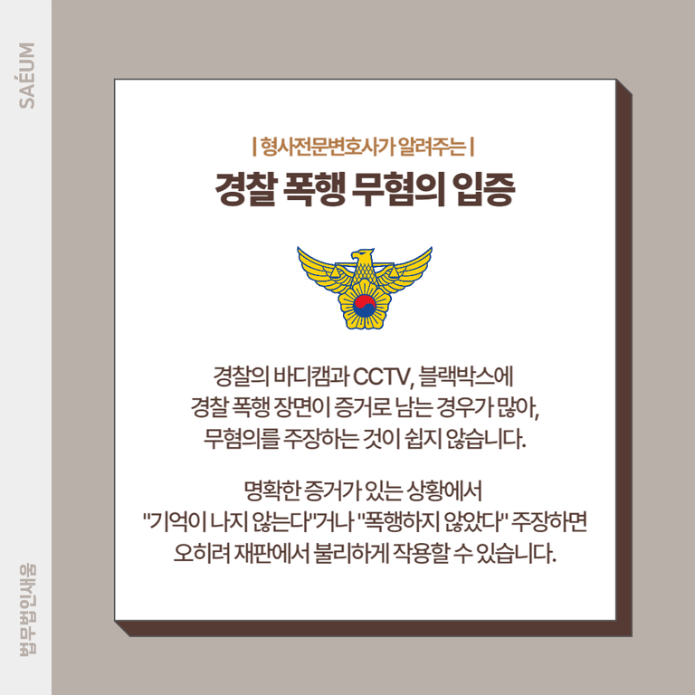 경찰의 바디캠과 주변 CCTV, 블랙박스 등을 통해 폭행 장면이 증거로 남는 경우가 많아, 무혐의를 주장하는 것이 쉽지 않습니다. 만약 명확한 증거가 있는 상황에서 "기억이 나지 않는다"거나 "폭행하지 않았다"고 주장하면, 오히려 재판에서 불리하게 작용할 수 있습니다. 따라서 불필요한 부인을 하기보다는, 당시 상황을 정확히 파악한 후 전략적으로 대응하는 것이 중요합니다.