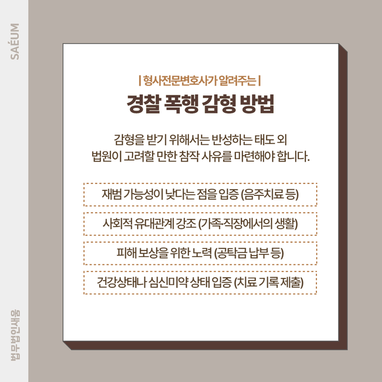 지금까지 경찰 폭행 및 공무집행방해 혐의의 처벌 수위와 대응 방법에 대해 알아보았습니다. 이 범죄는 합의가 어렵고 처벌도 무거운 편이어서 막연한 두려움을 느끼는 분들이 많습니다. 그러나 충분한 사유를 마련하고 적극적으로 대응한다면 감형이나 선처를 받을 가능성도 있습니다.