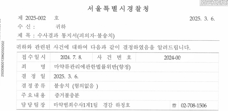 마약 구매 내역으로 특정하기가 어렵게 되자, 결국 경찰에서는 증거불충분으로 혐의없음 불송치