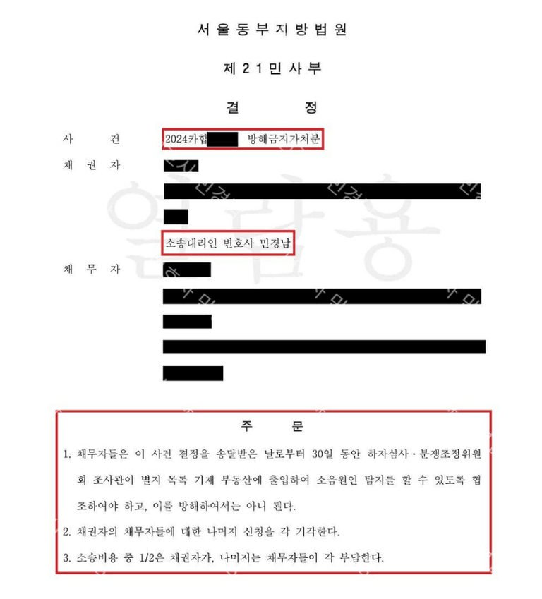 알 수 없는 소음과 임대인 및 임차인의 대응방식으로 인하여 의뢰인분이 겪게 되는 정신적 고통을 고려하여 재판부에서는 이 사건 방해금지가처분 신청 결정을 인용하는 결정을 하였습니다. 다만, 만약 결정이 났음에도 불구하고 임대인과 임차인이 비협조 할 경우를 대비하여 대체집행까지 동시에 신청하였으나 해당 부분에 대해서는 임대인과 임차인의 비협조시 별도의 신청으로 대체집행을 구하라는 취지에서 일부 기각을 하였습니다.