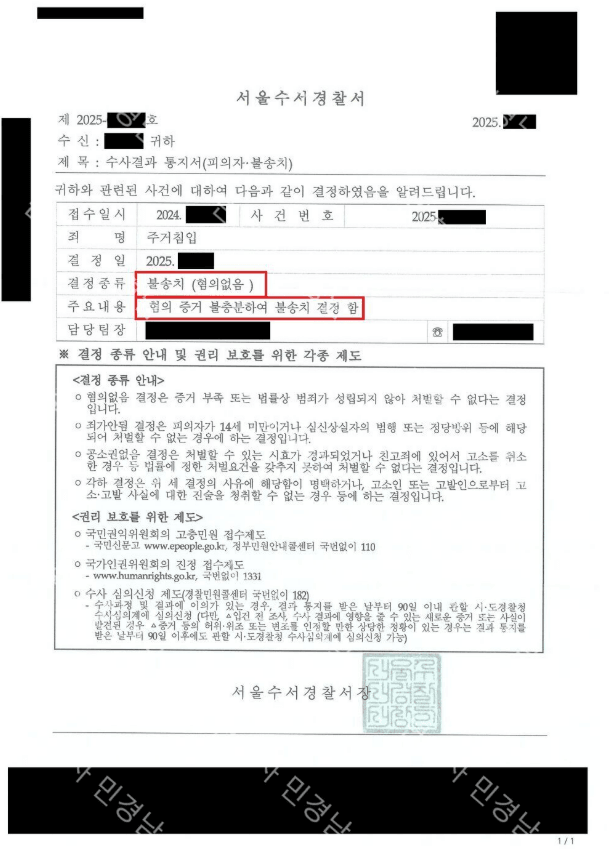 의뢰인은 경찰로부터 최종적으로 무혐의 처분을 받으시게 되셨고, 다시 일상으로 돌아가실 수 있게 되었습니다. 주거침입은 일상에서 흔하게 발생할 수 있는 사건으로서 술을 먹고 그랬다거나 주거침입의 고의가 없었다는 변명만으로는 무혐의를 받기 어렵기 때문에 주의하셔야 하는 사건입니다. 특히 주거침입은 반의사불벌죄가 아니므로 합의로도 해결이 어려운 경우가 많고, 주거침입을 한다는 생각을 하지도 못하고 경찰에 피의자로 입건되는 경우가 대다수이기 때문에 특별히 주의하실 필요가 있습니다.