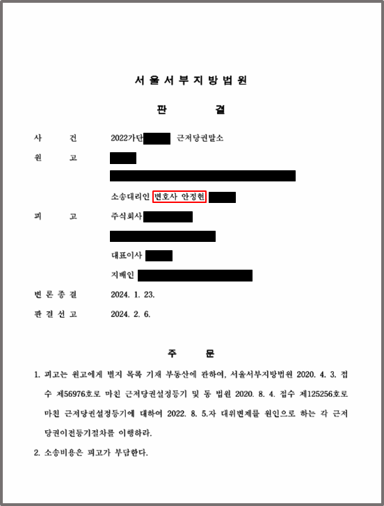 결과적으로는 의뢰인이 전부 승소하였고, 근저당권자 측이 전부 패소하였습니다.