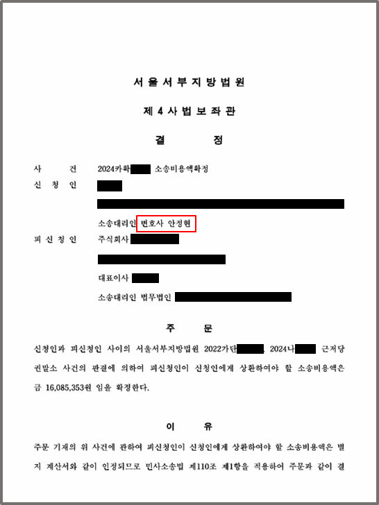 끝으로 근저당권자로 인해 발생된 변호사보수 등 소송비용까지도 모두 반환받으실 수 있도록 하였습니다.