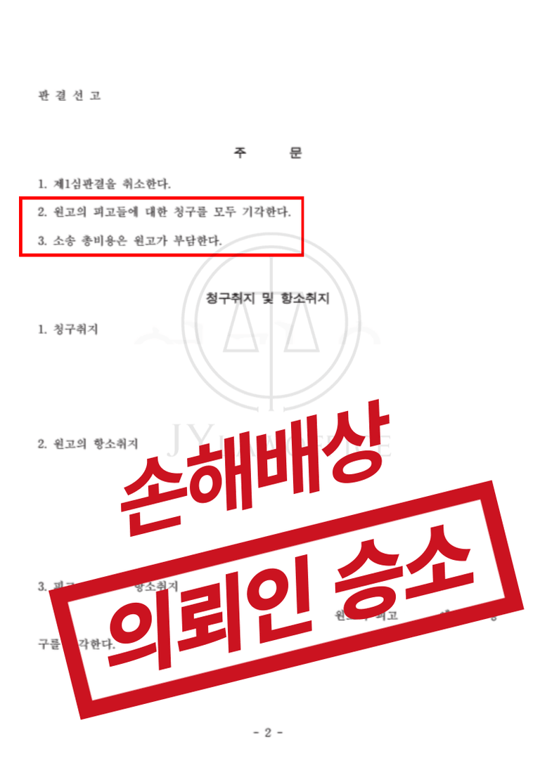 이러한 본 손해배상변호사의 조력에 따라 법원은 원고의 청구를 모두 기각하는 원고 패의 판결을 선고하였으며, 의뢰인은 불법행위 손해배상 책임에서 면제받을 수 있었습니다.