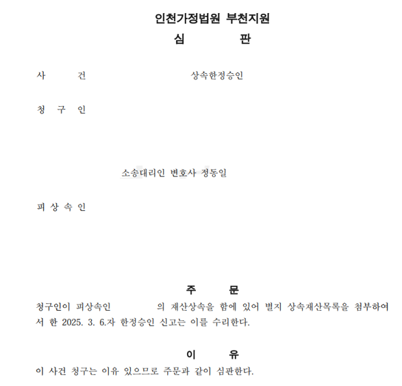 법원은 정동일 변호사의 소명을 받아들여, 의뢰인의 특별한정승인 신고를 수리하는 심판을 하였습니다.