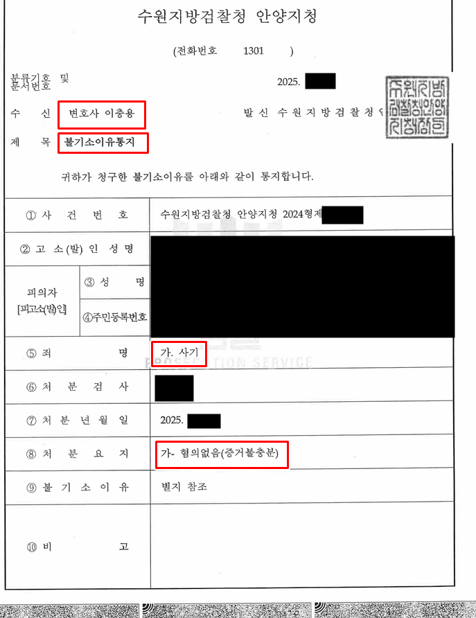 4. 결과 -투자금 사기 : 검찰 혐의없음 불기소 처분