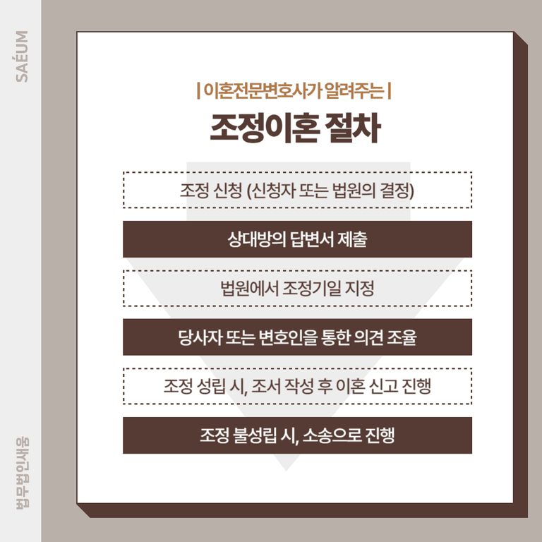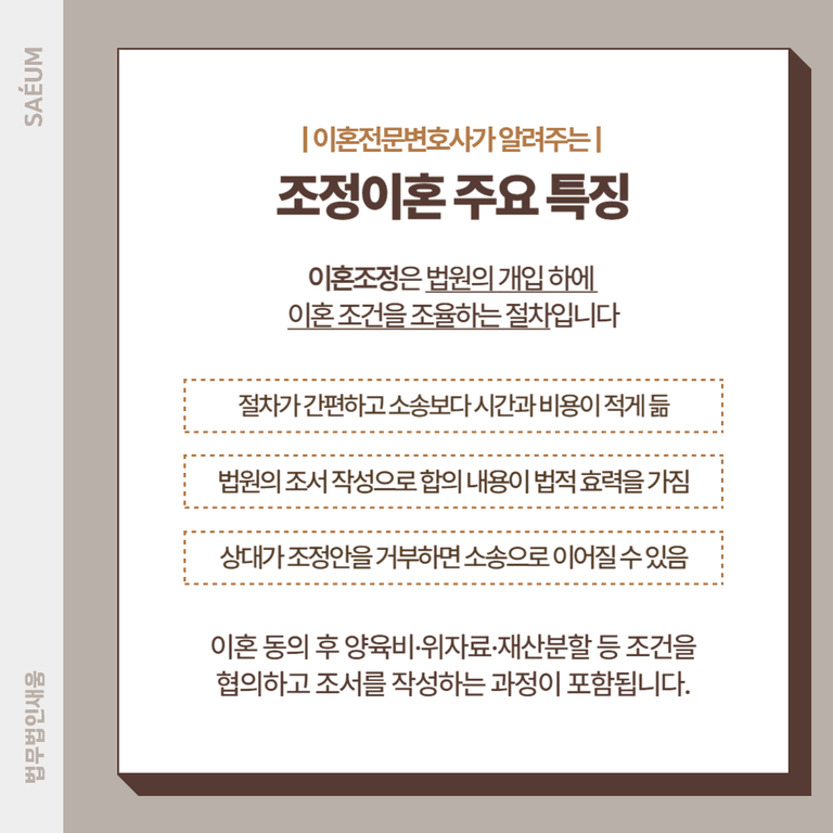 이혼조정은 협의이혼과 소송이혼의 중간 형태로, 법원의 개입 하에 이혼 조건을 조율하는 절차입니다. 이혼에 동의한 후 양육비, 위자료, 재산분할 등의 조건을 협의하고 법원 조서를 작성하는 과정이 포함됩니다.
