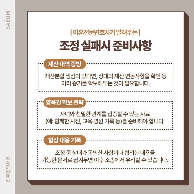 이혼조정이 원만하게 성립되면 가장 좋지만, 상대방이 끝까지 조정에 응하지 않거나 협상이 결렬될 경우 소송으로 이어질 가능성이 큽니다. 따라서 조정 절차를 진행하면서도 소송에 대비한 증거를 미리 준비하는 것이 중요합니다.