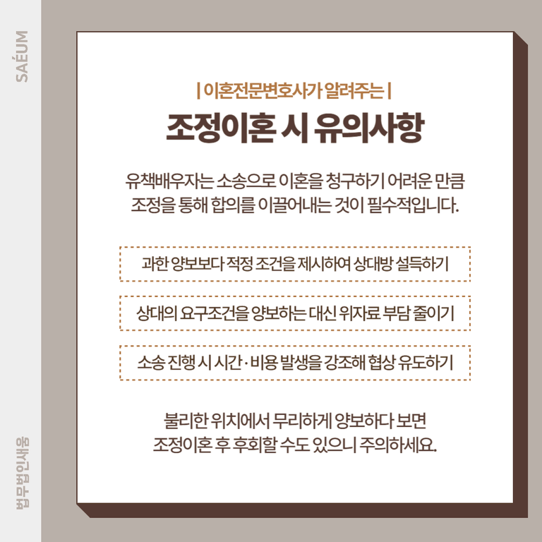 특히 유책배우자는 소송으로 이혼을 청구하기 어려운 만큼, 조정을 통해 합의를 이끌어내는 것이 필수적입니다. 하지만 불리한 위치에서 무리하게 양보하다 보면 이후 후회할 수도 있습니다.