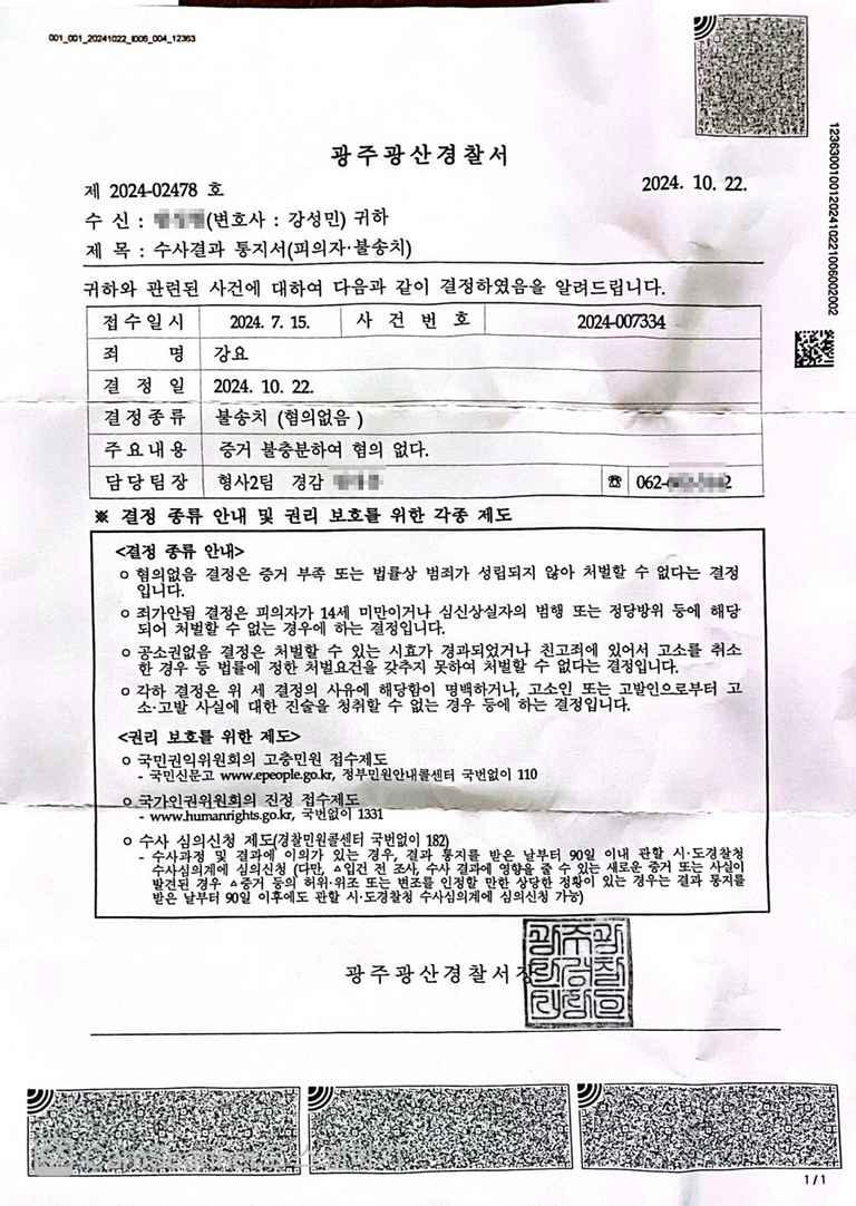 결국 저희측 주장이 받아들여졌고, 경찰에서 불송치결정(증거불충분)을 하였습니다.