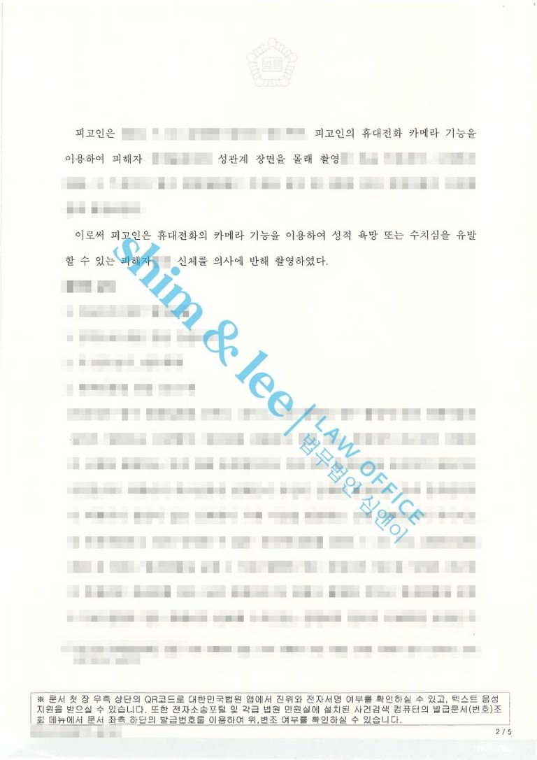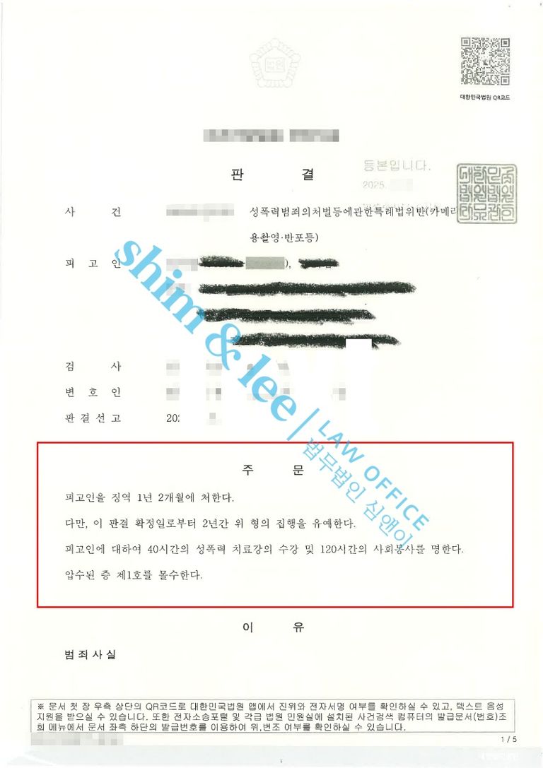 -가해자는 피해자의 동의 없이 신체를 촬영하여 성적 수치심을 주었다는 것이 인정되어 합의가 이루어졌음에도 징역 1년 2월, 집행유예 2년을 선고받았습니다. 또한, 성폭력 치료강의 40시간과 사회봉사 120시간이라는 엄중한 부가조항까지 함께 명령되었습니다.