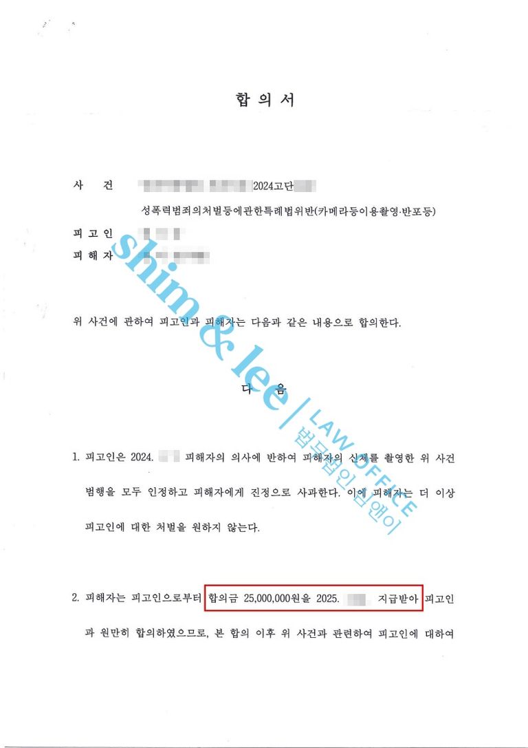 -대표 변호사님의 단호한 태도에 합의 결렬을 우려한 가해자는 합의금을 추가로 마련하겠다고 간절히 호소하였고, 결국 2,500만 원에 합의가 이루어졌습니다. 또한 비밀유지, 접근금지, 통신제한 등의 부가 조항을 추가하여 의뢰인에게 유리한 조항으로 합의를 진행하였습니다.
