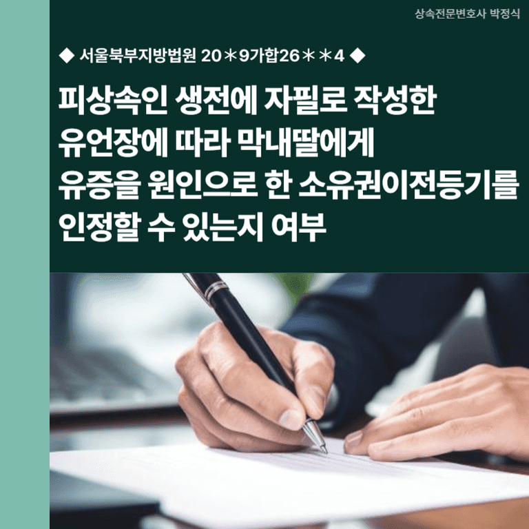 피상속인은 자신이 거주하고 있던 집을 원고에게 준다는 자필유언장을 작성하여 원고에게 준 이후 사망하였고, 원고는 피상속인의 공동상속인들인 피고들을 상대로 피상속인이 거주하던 집에 대하여 유증을 원인으로 한 소유권이전등기청구소송을 제기한 사안입니다.