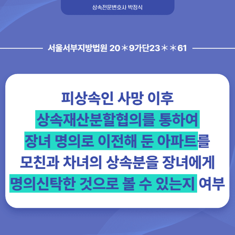 이후 15년 이상이 지난 시점에서 원고들은 위 아파트에 대한 모친과 차녀의 법정상속지분에 대하여 장녀인 피고에게 먕의신탁 한 것이라고 주장하면서, 위 아파트의 모친과 차녀의 각 법정상속분에 해당하는 지분에 대하여 진정명의회복을 원인으로 한 소유권이전등기청구 소송을 제기한 사안입니다.