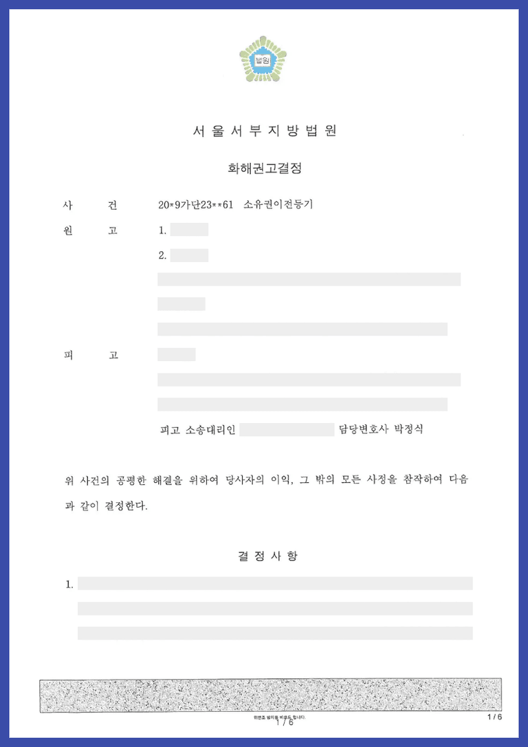 ③ 이에 재판부에서는 명의신탁이나 상속회복청구의 제척기간 문제를 판단하기에 앞서 원고들과 피고가 가족관계인 점, 피고가 모친의 의사를 존중할 의사가 있다는 점 등을 고려하여 모친인 원고가 해당 아파트에서 거주하지 않게 될 경우 이를 매각하여 매각대금의 35% 정도를 차녀에게 지급하기로 하는 화해권고 결정을 하였고, 당사자들이 이의를 제기하지 않아 화해권고 결정이 확정된 사안입니다.