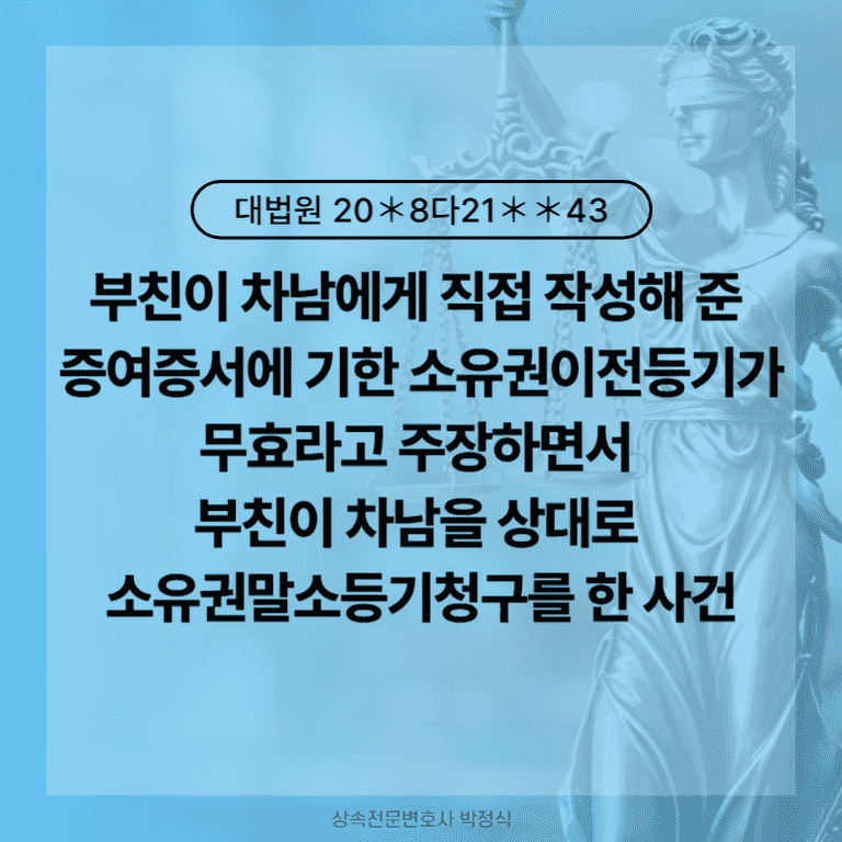이에 부친은 차남인 피고가 증여증서를 위조하여 해당 부동산에 대한 증여등기를 한 것이라고 주장하면서 피고와 금융기관을 상대로 소유권이전등기와 근저당권설정등기를 각 말소하라는 소송을 제기한 사안입니다.