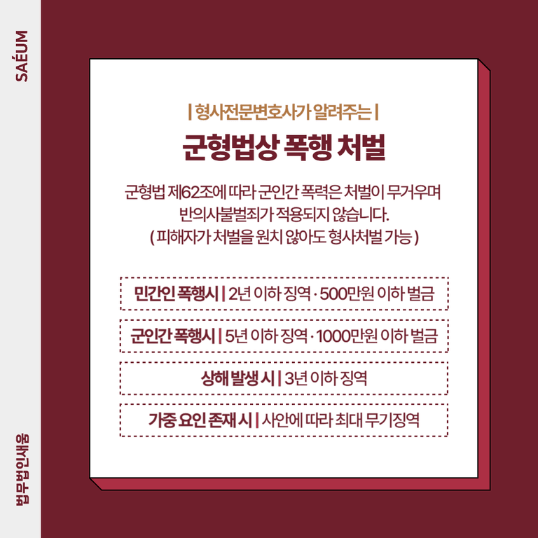 군대 내 폭행 사건은 민간과는 다른 법 적용을 받습니다. 군형법 제62조에 따르면 군인 간 폭력 사건은 민간보다 강한 처벌을 받게 되며, 반의사불벌죄가 적용되지 않습니다. 즉, 피해자가 처벌을 원하지 않더라도 형사처벌을 피할 수 없습니다.