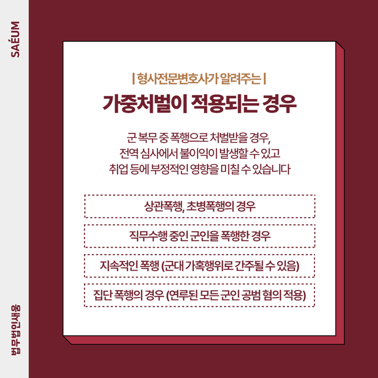 군대 내 폭행은 단순 폭행을 넘어 위계질서에 따라 가중처벌이 적용될 수 있습니다.